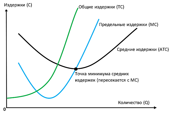 Точка минимума средних издержек соответствует предельным издержкам, поскольку они будут снижаться, пока они превышают предельные издержки, и будут расти, если они ниже предельных издержек. В неоклассической производственной функции, точка минимума средних переменных издержек достигается при нулевом выпуске (краевое решение).