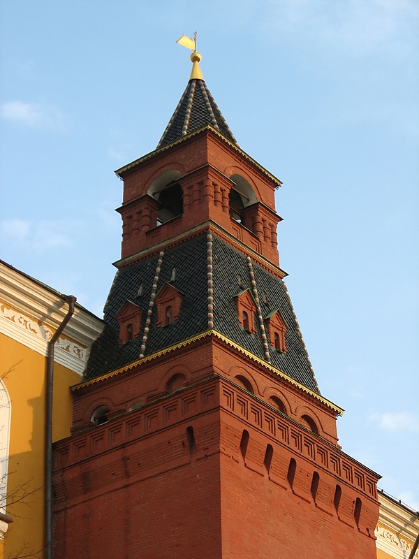 Опись кремлёвских имуществ 1821 года указывает на внешнее обветшание башни: «черепица местами обвалилась, лещадь на парапете истрескалась, карнизы ветхи, на башне растёт трава»[22]. В ходе восстановительных работ, проведённых архитектором Осипом Бове, башни и стены Московского Кремля заново побелили известью, башенные шатры покрасили зелёной краской, а флюгера обновили[48].
