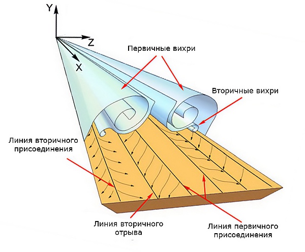 В то же время срыв потока может улучшать характеристики крыла. Так при обтекании крыльев малого удлинения и большой стреловидности (например, дельтовидного крыла) уже на малых углах атаки срыв потока с передней кромки крыла образует вихревые жгуты, которые сохраняются и на больших (свыше 40 градусов) углах.[4][5] Эти вихри не имеют противотечений, а потому создают дополнительную подъемную силу, позволяя сохранять управляемый полёт на больших углах атаки. При этом в создании вихря участвует в первую очередь корневая часть крыла. Это свойство нашло применение истребительной авиации 4-го поколения. Использование трапециевидного с развитым треугольным или оживальным наплывом, позволило добиться управляемости на закритичных углах атаки, сохранив взлетно-посадочные характеристики, чего крыло малого удлинения обеспечить не может.