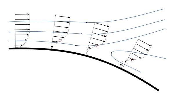 Среда вблизи обтекаемого тела в следствии вязкости движется медленнее, чем на удалении от нее. В соответствии с принципом Бернулли давление близлежащих слоёв оказывается больше, чем удалённых.[2] Возникает градиент давления. При достижении градиентом определённого значения, называемого неблагоприятным, происходит отрыв потока от поверхности. В результате образуется область оторвавшегося течения или зона отрыва, где характер течения сменяется с ламинарного на турбулентный. Срыв потока сказывается на аэродинамических характеристиках тела (подъёмной силе, сопротивлении и т.д.)[3]