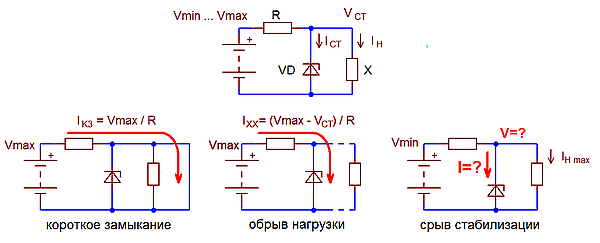 - Подача на вход стабилизатора максимально возможного напряжения питания при отключении нагрузки от выхода стабилизатора. Допустимый ток стабилитрона должен превышать расчётный ток через балластный резистор, определяемый по закону Ома. В противном случае при разогреве кристалла стабилитрона свыше +175 °C стабилитрон разрушается. Соблюдение паспортной области безопасной работы так же важно для стабилитронов, как и для транзисторов[91].