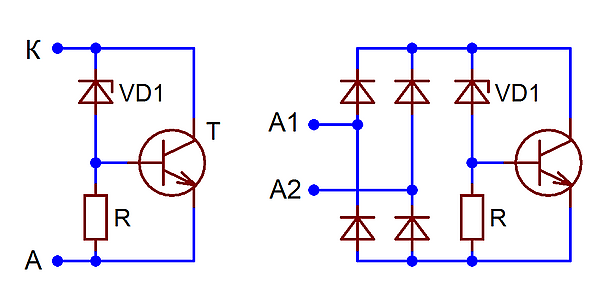 Схема составного стабилитрона не предназначена для работы на «прямом токе», но легко преобразуется в двустороннюю («двуханодный стабилитрон») с помощью диодного моста[96].