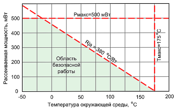 Ограничения по току и мощности очевидны, а ограничение по температуре требует оценки допустимой мощности, при которой расчётная температура p-n-перехода не превысит максимально допустимой. В технической документации такая оценка обычно приводится в форме графика зависимости допустимой мощности P от температуры окружающей среды Ta. Если такого графика нет, следует оценить допустимую мощность по формуле для температуры перехода Tj: