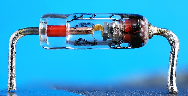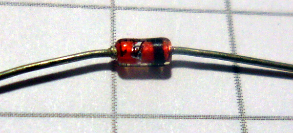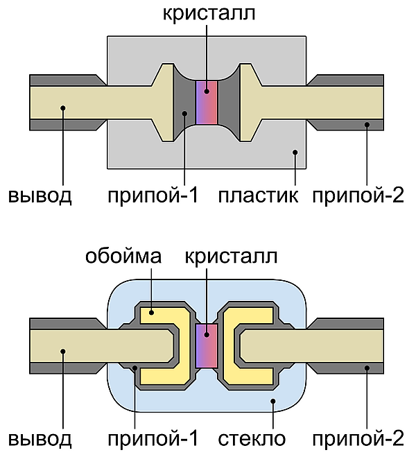 - Диоды в стеклянных корпусах DO-35 и DO-41 собираются в один этап. Между кремниевой таблеткой и торцами гибкого вывода из биметаллической проволоки вкладываются две полые, облуженные биметаллические обоймы. На собранную заготовку из кристалла, обойм и выводов надевается стеклянная трубочка — будущий корпус. Сборка нагревается в печи до температуры плавления стекла; при остывании вначале отвердевает стекло, формируя герметичный спай с металлом выводов, а затем — припой[30].