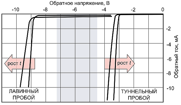 - В диодах с меньшими уровнями легирования, или меньшими градиентами легирующих примесей, и, как следствие, бо́льшими напряжениями пробоя наблюдается лавинный механизм пробоя. Он возникает при концентрациях примесей, примерно соответствующих напряжению пробоя в 4 EG (≈4,5 В), а при напряжениях пробоя выше 6,5 EG (≈7,2 В) полностью вытесняет туннельный механизм. Напряжение, при котором возникает лавинный пробой, с ростом температуры возрастает, а наибольшая величина ТКН пробоя наблюдается в низколегированных, относительно высоковольтных, переходах[25].