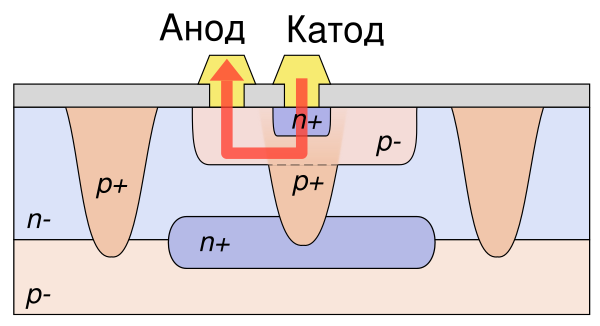 Ток пробоя обычного планарного стабилитрона сосредоточен в приповерхностном слое кремния — в слое с максимальной концентрацией дефектов кристаллической решётки и посторонних примесей. Именно эти примеси и дефекты и обуславливают нестабильность и шум стабилитрона. Улучшить его показатели можно, если «загнать» ток пробоя вглубь кристалла, в скрытую структуру p-n-перехода с меньшим, чем в приповерхностном слое, напряжением пробоя. В классической эпитаксиальной технологии на месте будущего стабилитрона формируется глубокий островок p+-типа проводимости, а затем проводится обычные диффузии базового (p-) и эмиттерного (n+) слоёв. Эмиттер созданной диодной структуры становится катодом стабилитрона, база — анодом. В приповерхностном слое этот переход имеет профиль проводимости n+-p-, а на дне базовой области — n+-p+. Высоколегированный n+-p+ переход имеет меньшее, чем в приповерхностном n+-p--слое, напряжение пробоя, поэтому весь обратный ток стабилитрона именно на дне базовой области[86].