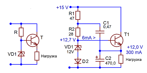 Простейшая схема последовательного стабилизатора также содержит только стабилитрон, транзистор и балластное сопротивление, но транзистор в ней включён по схеме с общим коллектором (эмиттерным повторителем). Температурный коэффициент такого стабилизатора равен алгебраической разнице Uст.ном. стабилитрона и Uбэ.мин. транзистора; для нейтрализации влияния Uбэ.мин. в практических схемах последовательно со стабилитроном включают прямо включённый диод VD2[98]. Минимальное падение напряжения на регулирующем транзисторе можно снизить, заменив балластный резистор на транзисторный источник тока.
