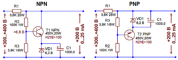 По соображениям безопасности и простоты монтажа в стабилизаторе положительного напряжения удобнее применять pnp-транзистор, в стабилизаторе отрицательного напряжения — npn-транзистор. В таких конфигурациях коллектор силового транзистора электрически соединён с общим проводом и его можно крепить непосредственно к шасси без изолирующих прокладок. По соображениям доступности и себестоимости в стабилизаторах любой полярности проще и дешевле применять npn-транзисторы. При напряжениях и токах, типичных для ламповых усилителей, ёмкость конденсатора, шунтирующего стабилитрон, должна составлять несколько тысяч мкФ. При этом она не только фильтрует низкочастотный шум стабилитрона, но и обеспечивает плавное нарастание напряжения при запуске схемы. Как следствие, при включении питания возрастает тепловая нагрузка на последовательное сопротивление R1[99].