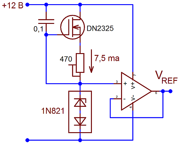 Термокомпенсированные стабилитроны обычно питаются постоянным током от транзисторного или интегрального источника тока. Использование базовой схемы с балластным резистором не имеет смысла, так как даже при питании схемы стабилизированным напряжением нестабильность по току будет неприемлемо велика. Слаботочные стабилитроны на ток 1 мА обычно запитываются от источников тока на биполярных транзисторах, полевых транзисторах с p-n-переходом, стабилитроны на ток 10 мА — от источников тока на МДП-транзисторах со встроенным каналом в режиме обеднения. Интегральные источники тока семейства LM134/LM334 допускают токи до 10 мА, но не рекомендуются к применению в схемах с током более 1 мА из-за высокой нестабильности по температуре (+0,336 %/°C)[101].