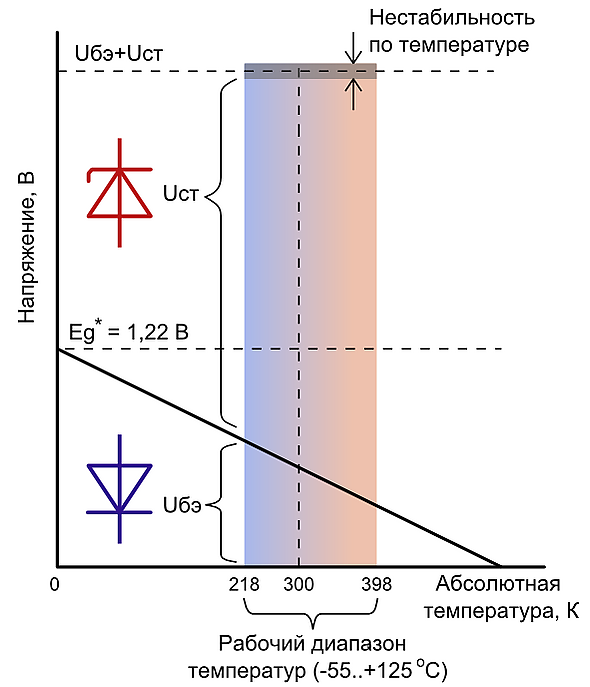 ГОСТ определяет температурный коэффициент напряжения как «отношение относительного изменения напряжения стабилизации к абсолютному изменению температуры окружающей среды» при заданном постоянном токе стабилизации[61]. ТКН обычных, не термокомпенсированных диодов, при их номинальных токах составляет для стабилитронов туннельного пробоя (Uст<4 Eg) от −0,05 до −0,1 %/°C, а для стабилитронов лавинного пробоя (Uст<4 Eg) — от 0,05 до 0,1 %/°C. Иными словами, при нагреве стабилитрона от +25 °C до +125 °C сдвиг напряжения стабилизации составит от 5 до 10 % начального значения.