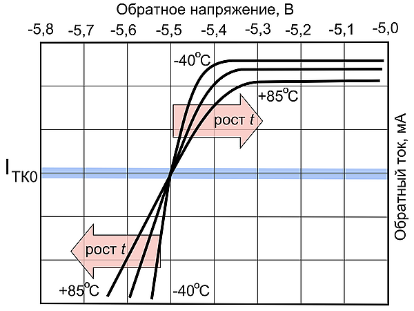 В области малых и средних токов на вольт-амперных характеристиках стабилитронов на напряжение 4,5…6,5 В[62] можно найти точку (значение тока ITK0 и напряжения UTK0), в которой температурный коэффициент близок к нулю. Если стабилизировать ток такого стабилитрона внешним источником тока на уровне, точно равном ITK0, то напряжение на стабилитроне, равное UTK0 практически не зависит от температуры. Такой подход применяется в интегральных стабилитронных источниках опорного напряжения, но не применим к устройствам на дискретных стабилитронах. Точное значение ITK0 можно определить только опытным путём, что в условиях серийного производства неприемлемо[63]. Стабилитроны на напряжение менее 4,5 В также имеют точку нулевого ТКН, но она находится за пределами области безопасной работы[62]. Стабилитроны на напряжение свыше 6,5 В имеют положительный (ненулевой) ТКН во всём диапазоне токов[62].