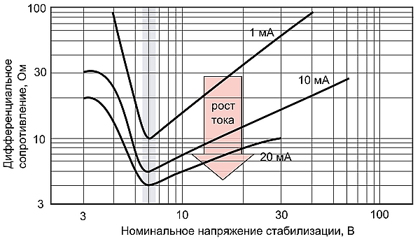 Для маломощного стабилитрона 2С133В дифференциальное сопротивление при минимальном токе стабилизации 1 мА равно 680 Ом, а при номинальном токе в 5 мА и температурах от —60 до +125 °C не превышает 150 Ом [59]. Стабилитроны бо́льшей мощности на то же номинальное напряжение имеют меньшее дифференциальное сопротивление, например, КС433А — 25 Ом при 30 мА. Дифференциальное сопротивление низковольтных лавинных диодов (LVA) примерно на порядок ниже, чем в «обычных» стабилитронах: например, для LVA351 (напряжение 5,1 В, мощность 400 мВт) оно не превышает 10 Ом при токе 10 мА[60]. Внутри каждого семейства стабилитронов (одной и той же максимальной мощности) наименьшие абсолютные значения дифференциального сопротивления при заданном токе имеют стабилитроны на напряжение 6 В[28].