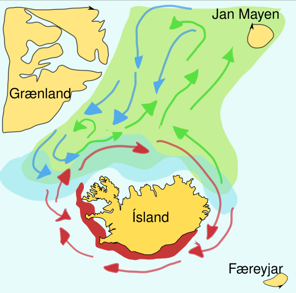 Мойва — кормовая рыба семейства корюшковых, которая обитает в Атлантическом и Северном ледовитом океане. Летом она нагуливается на плотных скоплениях планктона у края ледяного шельфа. Крупные особи также питаются крилем. Весной и летом большими стаями мойва мигрирует между местами нагула и нереста (Исландия, Гренландия и Ян-Майен). Их миграции подвержены влиянию океанических течений. Весной и осенью половозрелые особи движутся к северу на нагул вокруг Исландии. В сентябре-ноябре они плывут в обратном направлении. Миграция на нерест начинается в декабре-январе[21][22]. Схема справа показывает основные нерестилища и направление движения личинок. Зелёным цветом отмечена мойва, следующая на нагул, синим показано обратное направление, а красным цветом отмечены нерестящиеся рыбы.