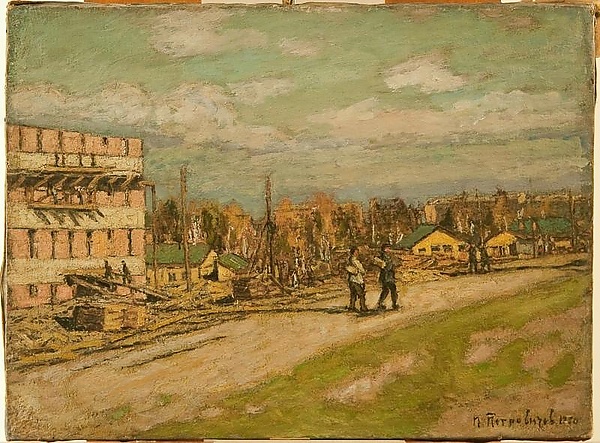 В центре композиции по диагонали проходит дорога, на которой изображены двое мужчин с сумками за плечами. Справа от дороги расположен участок земли, покрытый зелёной травой, слева — строящееся четырёхэтажное здание из розового кирпича с белыми горизонтальными плитами. Вдоль дороги тянутся одноэтажные домики с зелёными крышами, между которыми видны деревья с жёлтыми кронами. Верхнюю часть картины занимает небо в сине-зелёной цветовой гамме с белыми облаками.