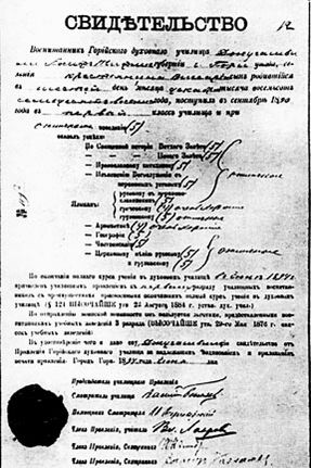 29 мая 1899 года, на пятом году обучения, был исключён из семинарии «за неявку на экзамены по неизвестной причине» (вероятно, фактической причиной исключения была деятельность Иосифа Джугашвили по пропаганде марксизма среди семинаристов и рабочих железнодорожных мастерских[37][38]). В выданном ему свидетельстве значилось, что он окончил четыре класса и может служить учителем начальных народных училищ[17].