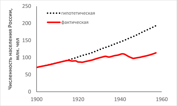 Сталинский период в целом характеризовался большими демографическими потерями. Первый демографический кризис 1933 года из-за голода привёл к потере пятилетнего естественного прироста (в 1935 году население СССР было таким же по размеру как и в 1930)[75]. Так же голод 1946—47 года усугубил и без того тяжёлые демографические последствия войны за счёт высокой детской смертности[142] и привёл к смерти около 1 млн человек[220]. Согласно переписи населения 1926 года в РСФСР проживало 100,9 млн человек (или 92,7 млн человек с учётом переданных позже территорий). На отметку в 100 млн человек республика смогла вернутся лишь в 1949 году[221] из-за негативных демографических последствий в результате массовых репрессий; высокой смертности в лагерях, во время высылки кулаков и депортации народов; огромных потерь во Второй мировой войне. С началом правления Сталина в 1926 году население России составляло 93 миллиона, к моменту его смерти в России проживало лишь 107 млн человек. По оценке А. Вишневского, без избыточных потерь сталинского периода россиян могло быть на 40 с лишним млн больше в 1953 году. При Сталине численность населения превратилась в тщательно охраняемую государственную тайну, результаты переписи населения были неоднократно фальсифицированы (так перепись 1937 года по результатам была объявлена вредительской)[166][220].