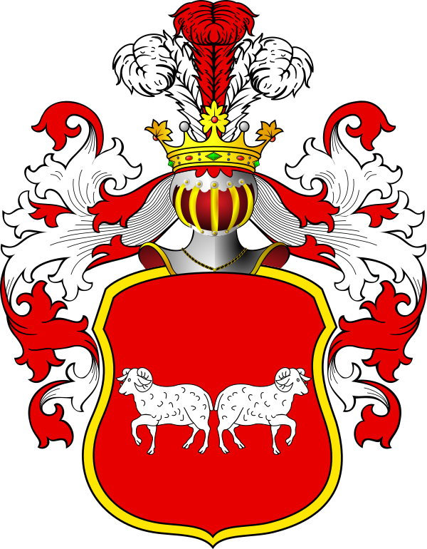 В щите с золотою окраиною, в красном поле, две белые овцы, одна от другой отвернувшиеся.