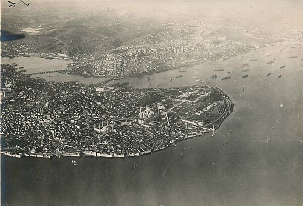 | Эрнст Кёрнер. Вид Константинополя, 1910 г. | Фотография Константинополя XIX век | Эминёню и Новая мечеть между 1890 и 1900 гг. | «Город Константинополь смотрит на юг в сторону Мраморного моря». Рукописная карта из турецкого морского атласа «Виды островов Средиземного моря», 1526, Галлиполи. | Карта Константинополя, опубликованная в словаре Брокгауза и Ефрона на рубеже веков |