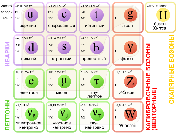 Краткий обзор различных семейств элементарных и составных частиц и теории, описывающие их взаимодействия. Элементарные частицы слева — фермионы, справа — бозоны. (Термины — гиперссылки на статьи РУВИКИ)