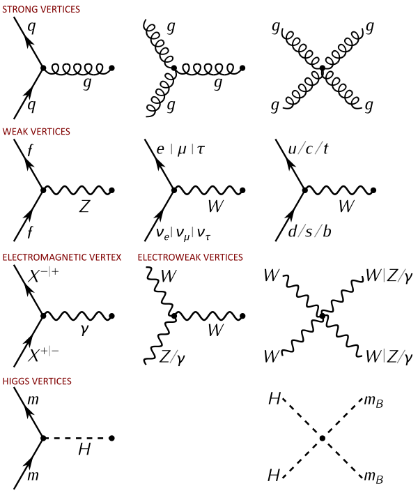 Взаимодействие между всеми частицами, описываемыми СМ, суммированы в диаграмме справа.