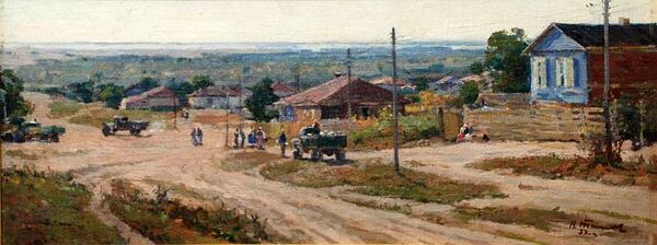 На полотне представлен летний пейзаж с диагонально проходящей деревенской улицей, выполненной в серо-охристых тонах. Вдоль улицы расположены дома за плетнями и телеграфные столбы, справа выделяется голубой дом с белыми ставнями, между постройками видна зелень деревьев. Слева и в центре улицы находятся три грузовика, на перекрёстке — группа людей, а у правого плетня — сидящие фигуры. Вдали открывается вид на голубовато-зелёную степь и узкую ленту реки у горизонта. Небо изображено светлым, что подчёркивает летнее настроение композиции.