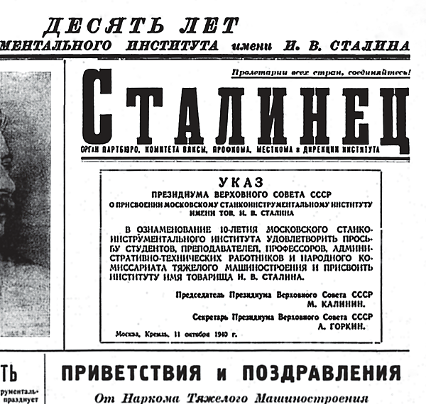 - 11.10.1940 года — 1956 — Московский станкоинструментальный институт имени И. В. Сталина