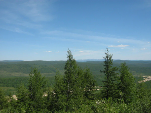 На склонах — лиственничная тайга, выше 1200 м — стелющиеся кедровники и горная тундра.