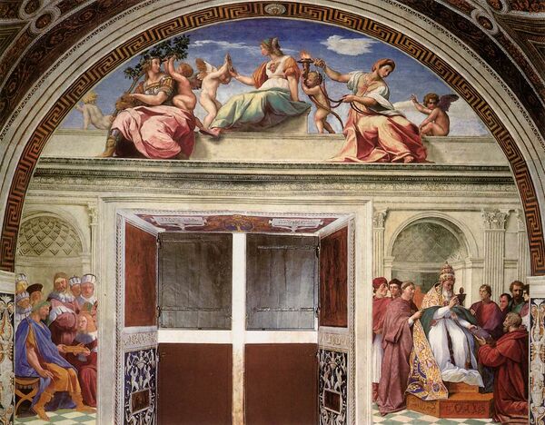 «Встреча Льва Великого с Аттилой» (итал. L'Incontro di Leone Magno con Attila) (1514). Рафаэль с учениками изобразил бурную сцену: Справа — гунны, разгорячённые сражением, в центре — их вождь Аттила, а слева — сам понтифик и его свита, земная и небесная, действуют спокойно в своей непогрешимости на фоне вечного города.