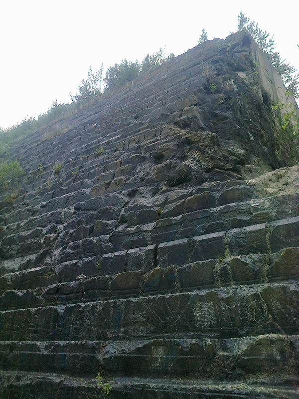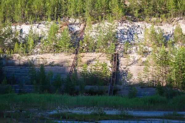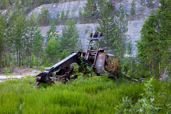 Из всего музейного карьерного оборудования над поверхностью осталась только старая таль, подвешенная над карьером на канатах и устройство, благодаря которому она двигалась, находящееся на краю карьера.