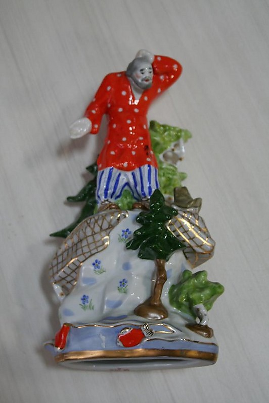 Скульптура представляет собой фигуру пожилого человека. Он почёсывает затылок левой рукой, а правая отведена в сторону. Он одет в красную рубаху с белым горохом, подпоясанную чёрным кушаком. На фигуре надеты шаровары с голубо-синей полоской и лапти. У старика на ногах располагается золотистая сеть. Рядом с фигурой изображены деревья, ёлочки и берёзки. Постамент, символизирующий море, украшен двумя красно-золотыми рыбками.