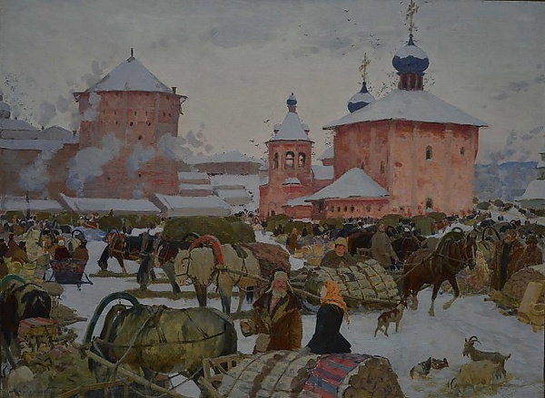 На картине изображён зимний базар у Троице-Сергиевой лавры. В центре композиции находятся мужчина в шапке с опущенными ушами и тулупе и женщина в жёлтом платке и чёрном пальто, которые беседуют друг с другом. Перед ними стоит запряжённая в сани лошадь, жующая сено. В правом углу размещены две козы, гусь и утка. За ними видны многочисленные сани с лошадьми и людьми. На заднем плане справа изображены заснежённые красные Введенская и Пятницкая церкви, а слева — красная Пятницкая башня, перед которой расположены торговые палатки.
