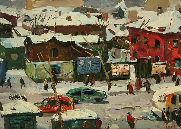 На полотне представлен городской пейзаж с фрагментарной композицией. На переднем плане изображена стоянка автобусов; слева в углу располагается небольшая тёмно-зелёная будка, справа — частично показан автобус, обрезанный краем холста. По шоссе движутся автомобили и люди. Во втором плане выстроены двухэтажные дома: центральный дом выделяется голубовато-зелёным первым и коричневым вторым этажами, дом справа — красного цвета и также обрезан границей холста. Между зданиями проходит тёмно-зелёный забор с наклеенными афишами. Вдали видны крыши других домов, а в верхней части картины — узкая полоска неба. Живопись выполнена широкой, пастозной манерой с преобладанием холодных белых, голубых и сиреневых тонов, которые подчёркивают заснеженные крыши и шоссе, а также сочетаются с яркими цветовыми акцентами в изображении зданий, машин и фигур людей.