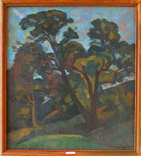 На картине представлен летний пейзаж с деревьями. На переднем плане изображены тёмно-зелёные склоны, освещённые охристо-жёлтым светом. Справа выделяется тёмный ствол дерева с широкой кроной, расположенный на фоне яркого неба, сочетающего голубоватые, зеленоватые и сиреневатые оттенки. В нижней части композиции среди деревьев заметен охристый ствол. Работа отличается декоративностью, свободной манерой письма и широкими мазками, что подчёркивает насыщенность цветовой гаммы.