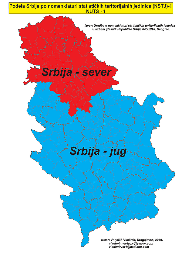 В начале 2010 года возобладала идея сокращения числа статистических регионов. Причина была в неравномерности населении после первого деления[3]. Так в Воеводине проживало около двух миллионов человек, а западный регион включал не более восемьсот тысяч[4]. Новое деление строго основывалось на Номенклатуре территориальных единиц для целей статистики ЕС и включило в себя две территориальные единицы первого уровня (фр. nomenclature des unités territoriales statistiques, NUTS1, население от 3 до 7 миллионов человек): Сербия-север (код RS1) и Сербия-юг (RS2). Территориальные единицы второго уровня (NUTS2, население от 800 тысяч до 3 миллионов человек): Воеводина (RS11) и округ Белград (RS12) — вместе образуют Сербию-север; Шумадия и Западная Сербия (RS21), Южная и Восточная Сербия (RS22) и Автономный край Косово и Метохия (RS23) — Сербия-юг. В свою очередь, территориальные единицы второго уровня разделены на территориальные единицы третьего уровня (NUTS3, население от 150 до 800 тысяч человек). По всей стране их насчитывается 29.
