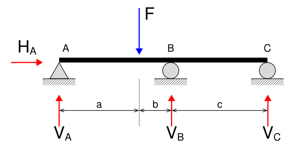 Поскольку неизвестных четыре (VA, VB, VC и HA) а уравнения только три, невозможно определить величину всех опорных реакций. Система следовательно статически неопределимая. Такие системы рассчитываются методами сопротивления материалов и строительной механики. Известно, например, уравнение трёх моментов.