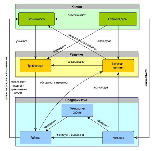 На рисунке показано взаимодействие основных сущностей и объектов, встречающихся в проекте. Объекты сгруппированы между собой в области интересов. Таким образом, стейкхолдер относится к области интересов клиента (англ. client), так как эта область содержит все, что касается использования и эксплуатации системы[4]:13-14.