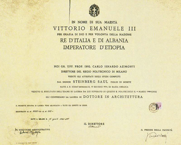 Сол Стейнберг родился в румынском городке Рымнику-Сэрат в центральной области Румынии[7] в семье переплётчика, производителя картонных коробок Мориса (Мауриче) Стейнберга и его жены, Розы Якобсон-Стейнберг. Учился вначале в университете Бухареста (1932—1933 гг.). В 1940 году завершил образование, пройдя курс на архитектурном отделении Politecnico di Milano, Милан. Диплом профессионального зодчего ему так никогда не пригодился (если отвлечься от присущего рисункам Стейнберга тонкого чувства архитектурных стилей и принципов градостроительства; от его мастерства в передаче линейной перспективы и трёхмерного пространства в целом).