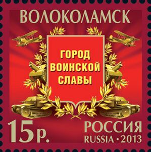30 января 2013 года Почта России выпустила почтовую марку, а 17 октября 2013 года Центральным банком России в обращение была выпущена памятная монета «Город воинской славы Волоколамск» номиналом 10 рублей[12]. Ещё одним символом стал Меч Победы, вручённый Волоколамску, как и другим городам воинской славы, 9 июня 2022 года в зале Славы Музея Победы в парке Победы на Поклонной горе в Москве. Изготовленный в Златоусте меч покрыт золотом высшей 999,9 пробы и инкрустирован уральскими самоцветами — гранатами, символизирующими пролитую кровь, и голубыми топазами, которые считаются символом мира. Длина мечей составляет 1,2 метра, вес — более пяти килограммов. На клинке, украшенном растительным орнаментом, высечены знаменитые слова князя Александра Невского: «Кто с мечом к нам придёт, тот от меча и погибнет». Ранее, в апреле 2015 года, аналогичные Мечи Победы были переданы на вечное хранение городам-героям[13][14].