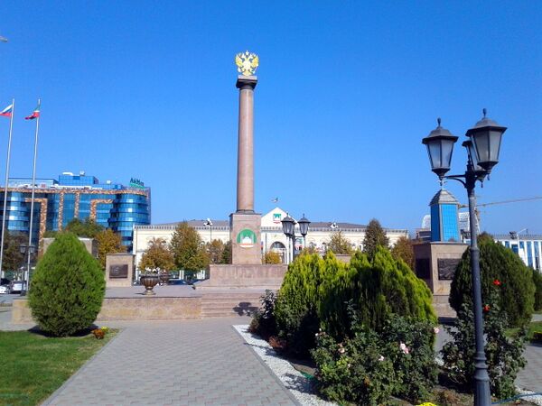 Памятник представляет собой колонну высотой 13,42 метра, выполненную из гранита и установленную на постаменте. На вершине стелы размещён герб Российской Федерации в виде позолоченного двуглавого орла. Основание украшено плитами с текстом указа Президента Российской Федерации, а также геральдическими символами страны, Чеченской Республики и города Грозного[3].