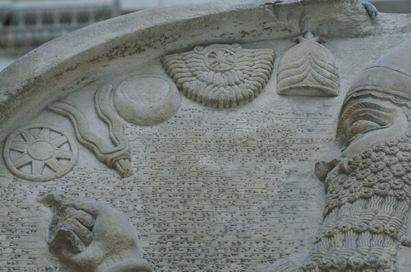 На стеле весом более 4 тонн и высотой 3 метра изображён ассирийский царь, поклоняющийся пяти богам[4]. Монарх изображён в конической шапке и с бородой, в вытянутой правой руке он щёлкает пальцами, а в левой держит булаву — символ царской власти. Пять божеств символически представлены в левом верхнем углу стелы: Ашшур — рогатым шлемом, Шамаш — крылатым диском, Син — полумесяцем, Адад — вилообразной линией и Иштар — в виде звезды. Стелу покрывает большое количество клинописного текста, в котором записаны военные триумфы и завоевания царя.