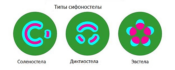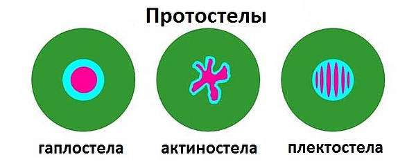 Первые три типа стел (протостелы) характерны для наиболее примитивных сосудистых растений.
