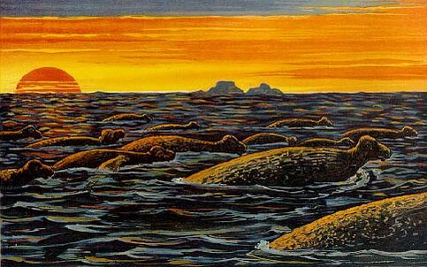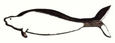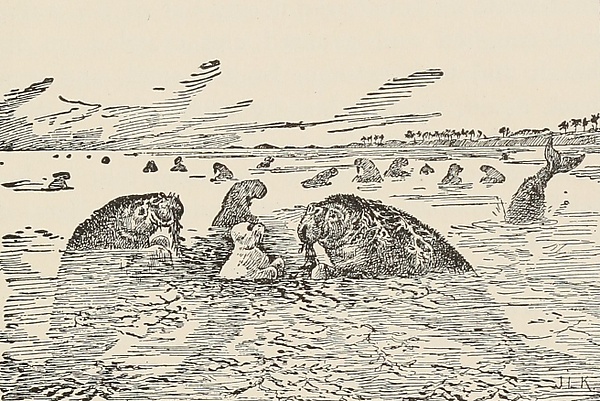 Создания и впрямь имели престранный вид и не похожи были ни на кита, ни на акулу, ни на моржа, ни на тюленя, ни на белуху, ни на нерпу, ни на ската, ни на спрута, ни на каракатицу. У них было веретенообразное туловище, футов двадцать или тридцать в длину, а вместо задних ластов — плоский хвост, ни дать ни взять лопата из мокрой кожи. Голова у них была самой нелепой формы, какую только можно вообразить, а когда они отрывались от еды, то начинали раскачиваться на хвосте, церемонно раскланиваясь на все стороны и помахивая передними ластами, как толстяк в ресторане, подзывающий официанта[33].