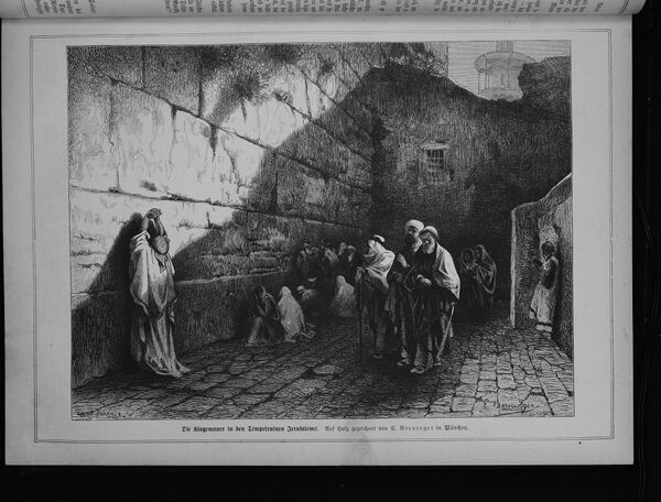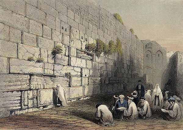 "Днём в пятницу, 13 марта 1863 года, автор посетил это святое место. Здесь он нашёл от одной до двух сотен евреев обоего пола, которые стояли или сидели, и кланялись, читая, скандируя или декламируя, и совершали телодвижения вперёд и назад, и слёзы текли по многим из лиц; они целовали стены и писали на них предложения на иврите… чаще всех используется стенание из Псалма 79: «Боже, пришли народы в удел Твой, осквернили храм святой твой…» |
