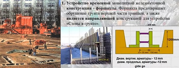 - По периметру котлована сооружения строится форшахта — железобетонное ограждение, обеспечивающее проектную точность будущей стены и предотвращающее обвал грунта с верхней части траншеи.