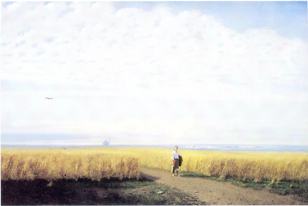 Между двумя полями зритель видит часть широкой пыльной дороги, уходящей вдаль. По дороге идет молодая крестьянка в белой свободной рубахе и темной юбке. Через левую руку перекинута какая-то одежда темного цвета. Крестьянка идет босиком, а в правой руке несет предмет красного цвета, похожий на сапоги[1]. Таким образом автор дает понять зрителю, что прохладное утро сменилось жарким днем, и молодая женщина, вышедшая в дорогу утром, вынуждена была из-за жары снять с себя более теплую одежду и сапоги.