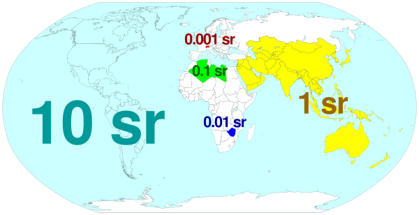 Поверхность сферы, наблюдаемая из её центра образует телесный угол стерадиан; соответственно, 1 ср = 1⁄4π ≈ 0,0796 полного телесного угла (сферы), или (180⁄π)² ≈ 3282,8 квадратного градуса.