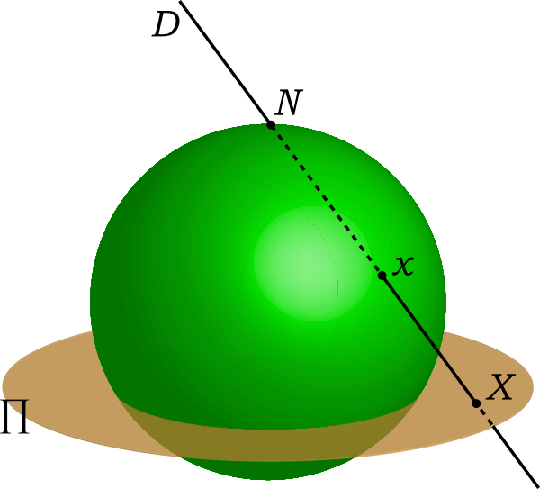Точка (северный полюс сферы) является точкой на максимальном расстоянии от плоскости . Через каждую точку сферы проходит единственная прямая , соединяющая и . Прямая пересекает плоскость в единственной точке , которая, таким образом, является образом точки при стереографической проекции. В результате получается взаимно однозначное отображение сферы с выколотой точкой на плоскость .