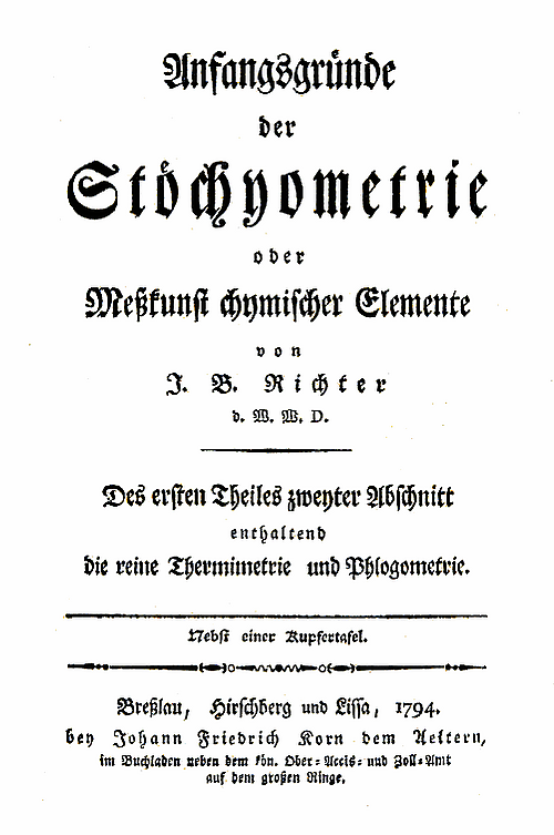 Термин «стехиометрия» ввёл И. Рихтер в книге «Начала стехиометрии, или Искусство измерения химических элементов» (J. B. Richter. Anfangsgründe der Stöchyometrie oder Meßkunst chymischer Elemente. Erster, Zweyter und Dritter Theil. Breßlau und Hirschberg, 1792-93), обобщивший результаты своих определений масс кислот и оснований при образовании солей[4].