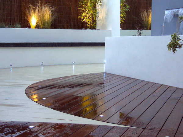 В таких садах часто используют простые и прямые линии, а также отдают предпочтение твёрдым ландшафтным материалам, таким как камень, древесина и облицованные стены.
