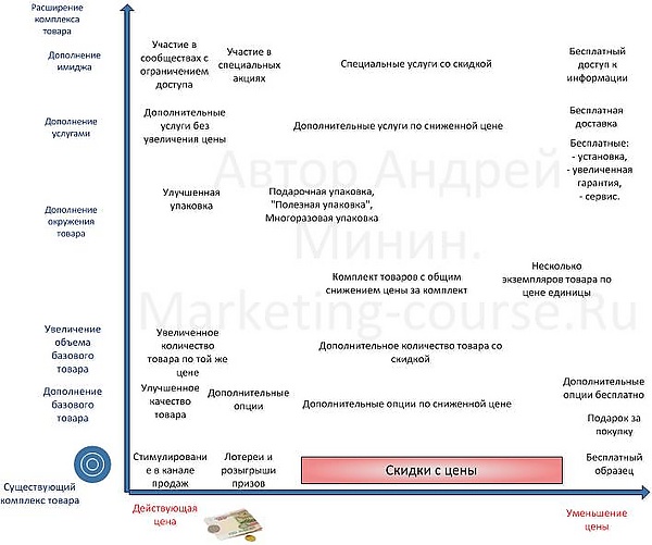 Основываясь на принципах стимулирования сбыта, возможно построить матрицу приемов стимулирования быта, по одной оси которой изменение цены, по второй - изменение ценности, за счет изменения комплекса товара. [2]
